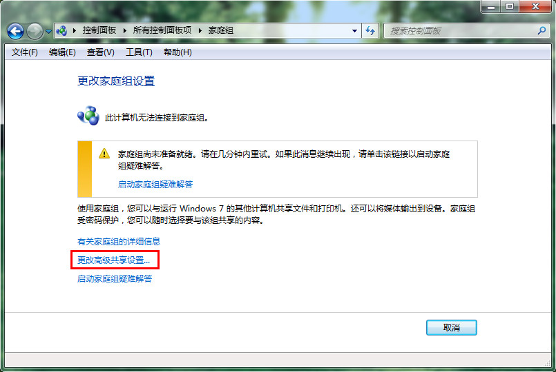 3、打开家庭组界面后,直接点击“更改高级共享设置”选项,如下图所示: